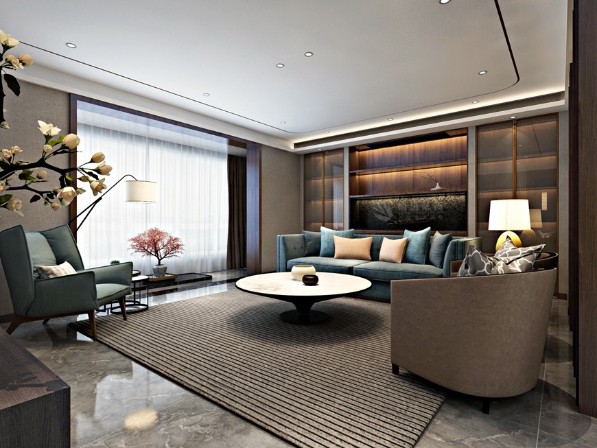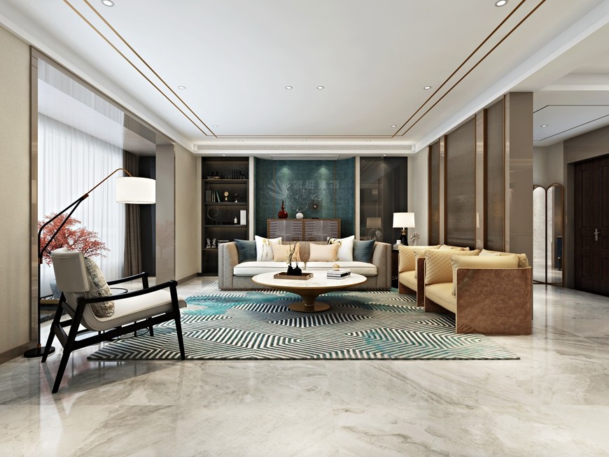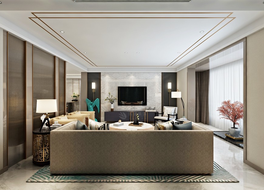 ▲西安(ān)魯班裝(zhuāng)飾出品湖(hú)城大境八号地天錦230平米現代簡約風馬超設計師主筆(bǐ)設計方案三——客廳沙發背景牆設計效果圖