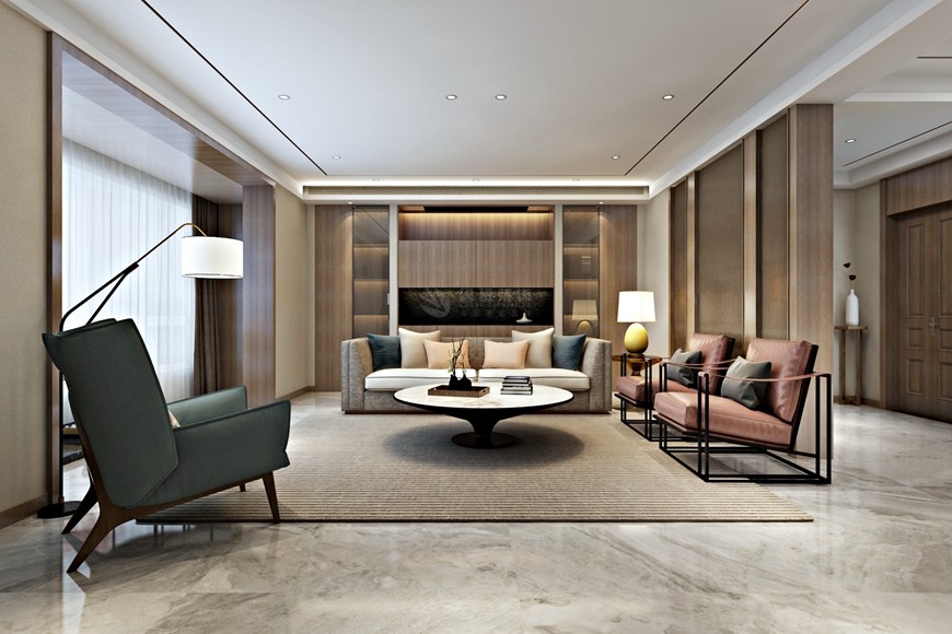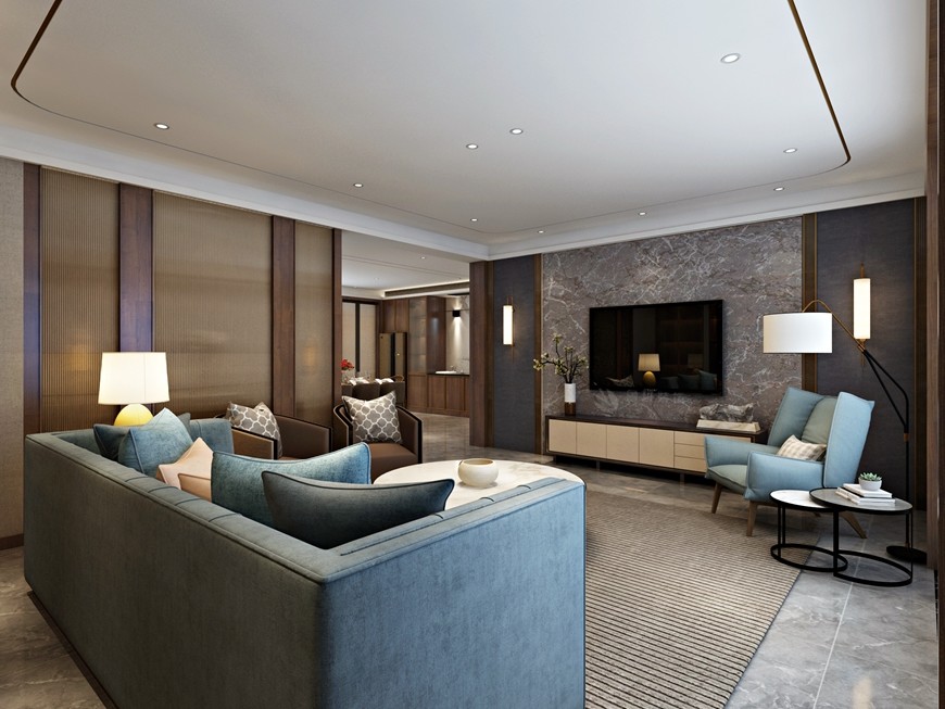 ▲西安(ān)魯班裝(zhuāng)飾出品湖(hú)城大境八号地天錦230平米現代簡約風馬超設計師主筆(bǐ)設計方案一——客廳沙發背景牆設計效果圖